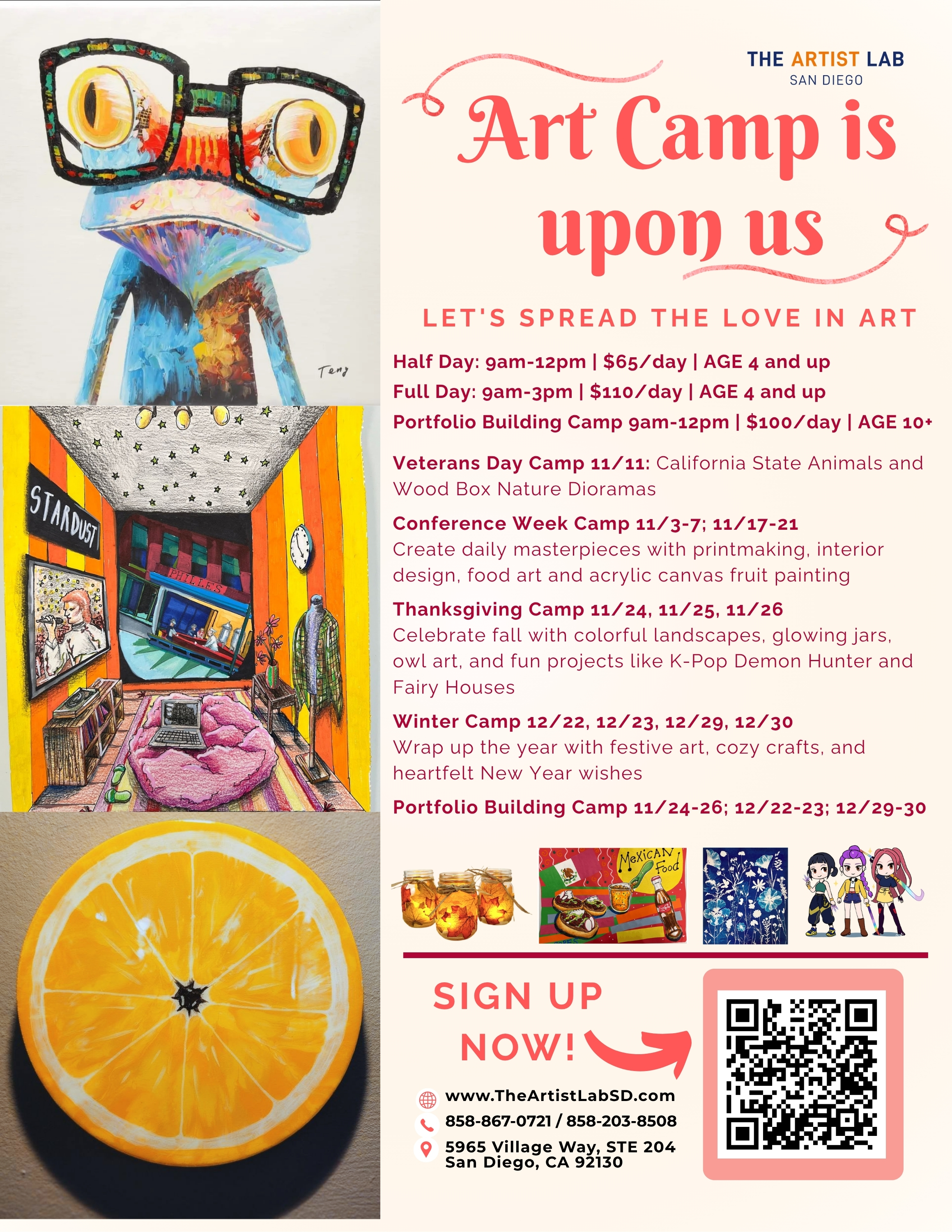 (11/11) Veterans Day Camp Full Day 9:00am-3:00pm $110 per class From $110 per visit with 1 DAY Art Camp- Full Day 9:00-3:00pm pass Purchase required to enroll